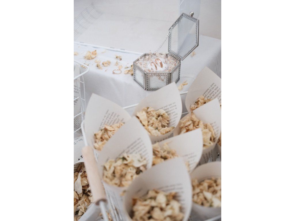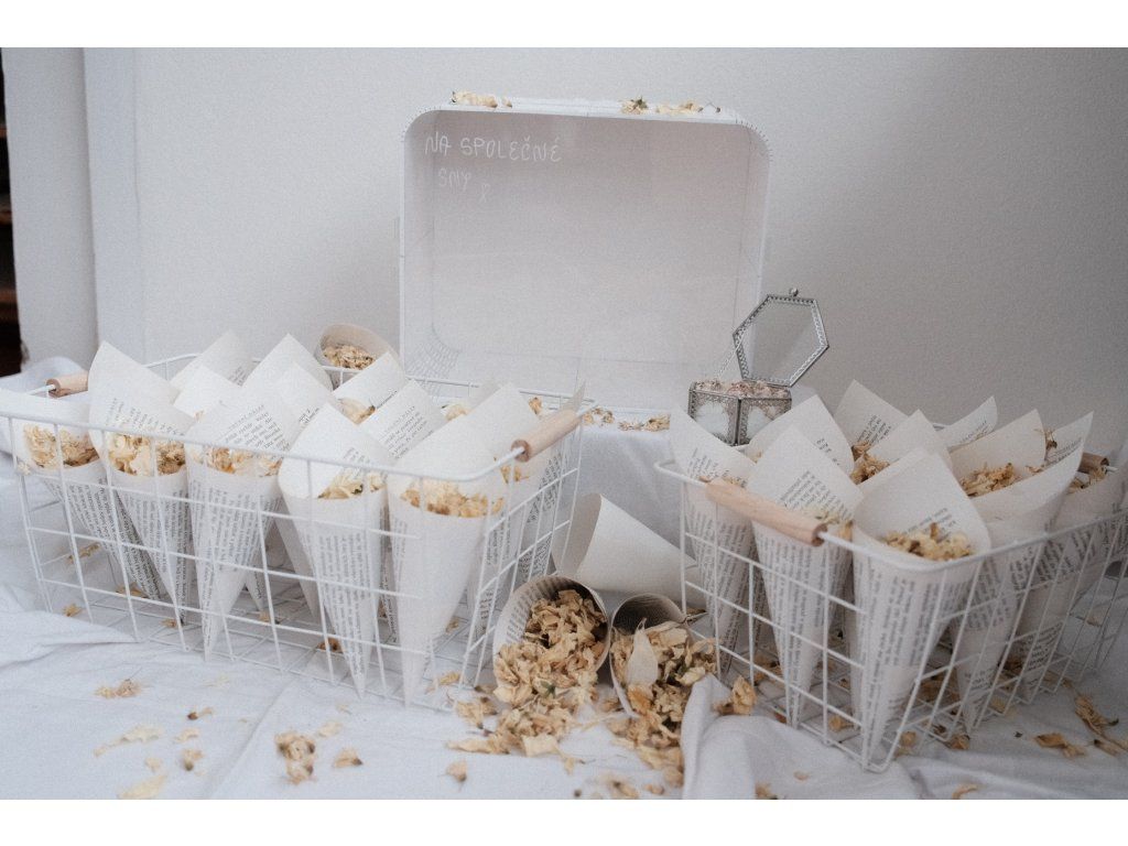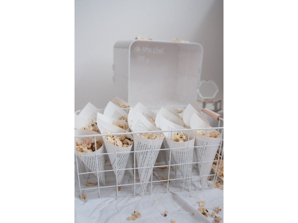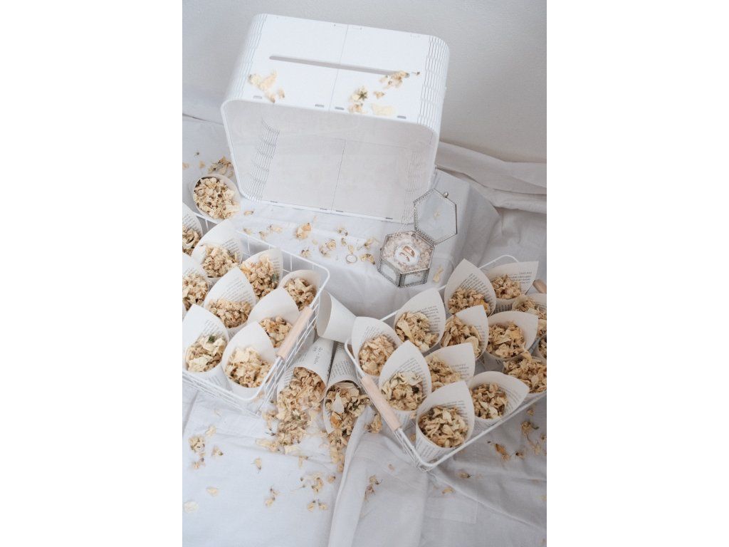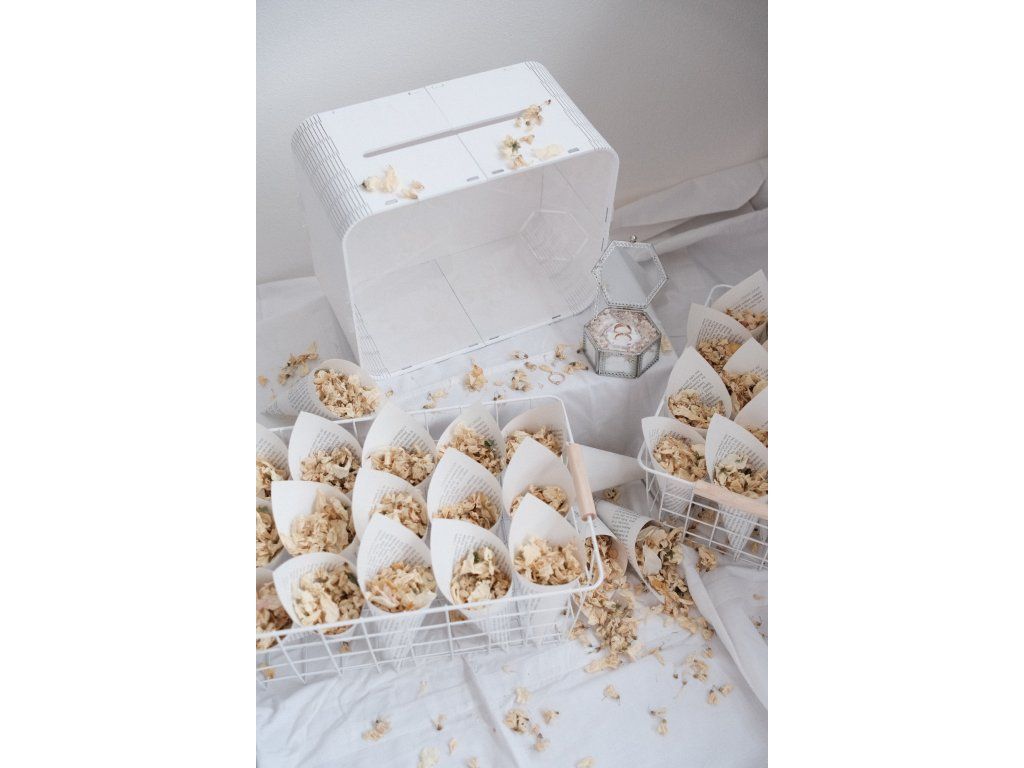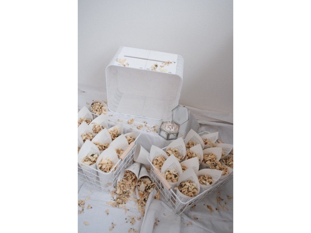 Sada 32 ks kornoutků se sušenými bio květy + krabička na prsteny se sušeným nevěstiným závojem + truhlička na dary.