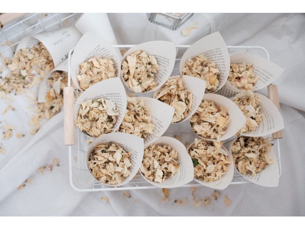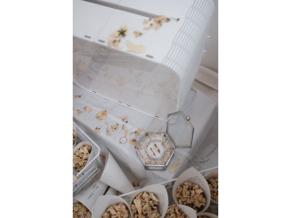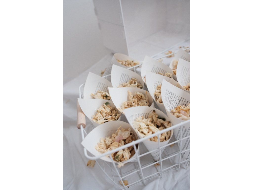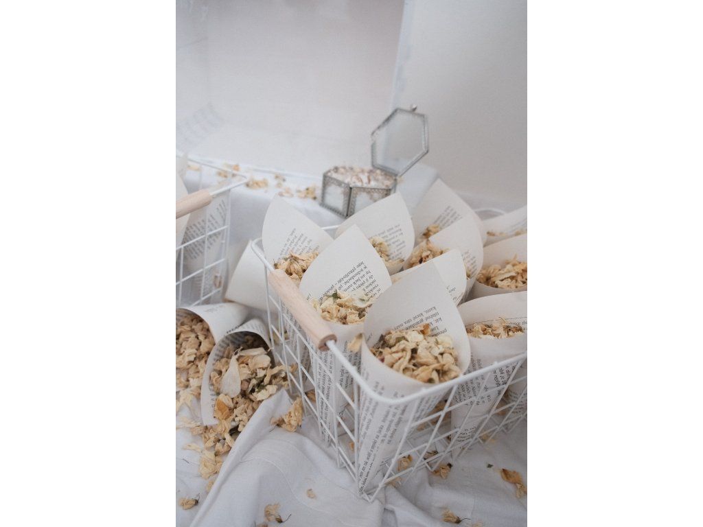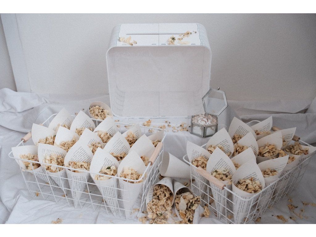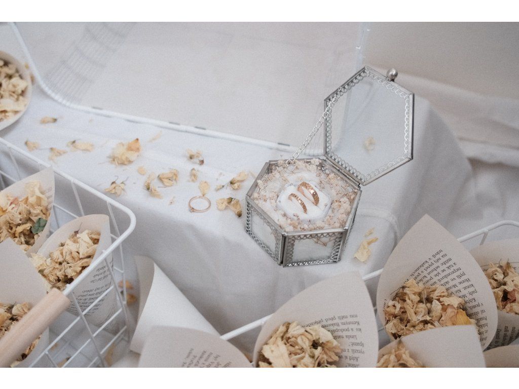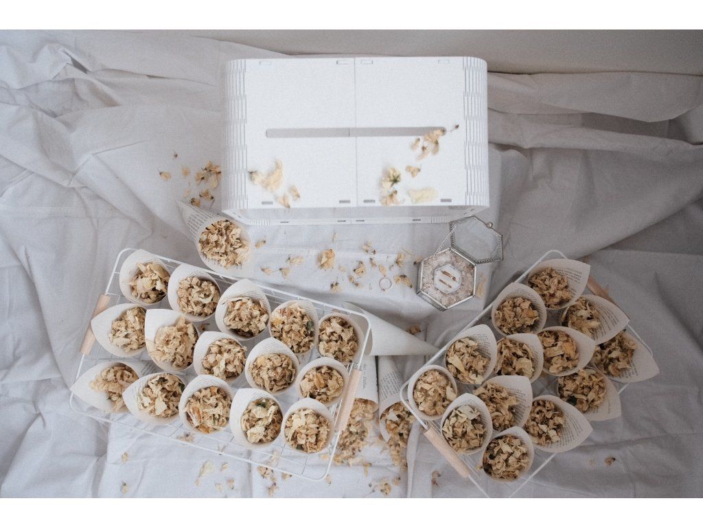 Sada 32 ks kornoutků se sušenými bio květy + krabička na prsteny se sušeným nevěstiným závojem + truhlička na dary.